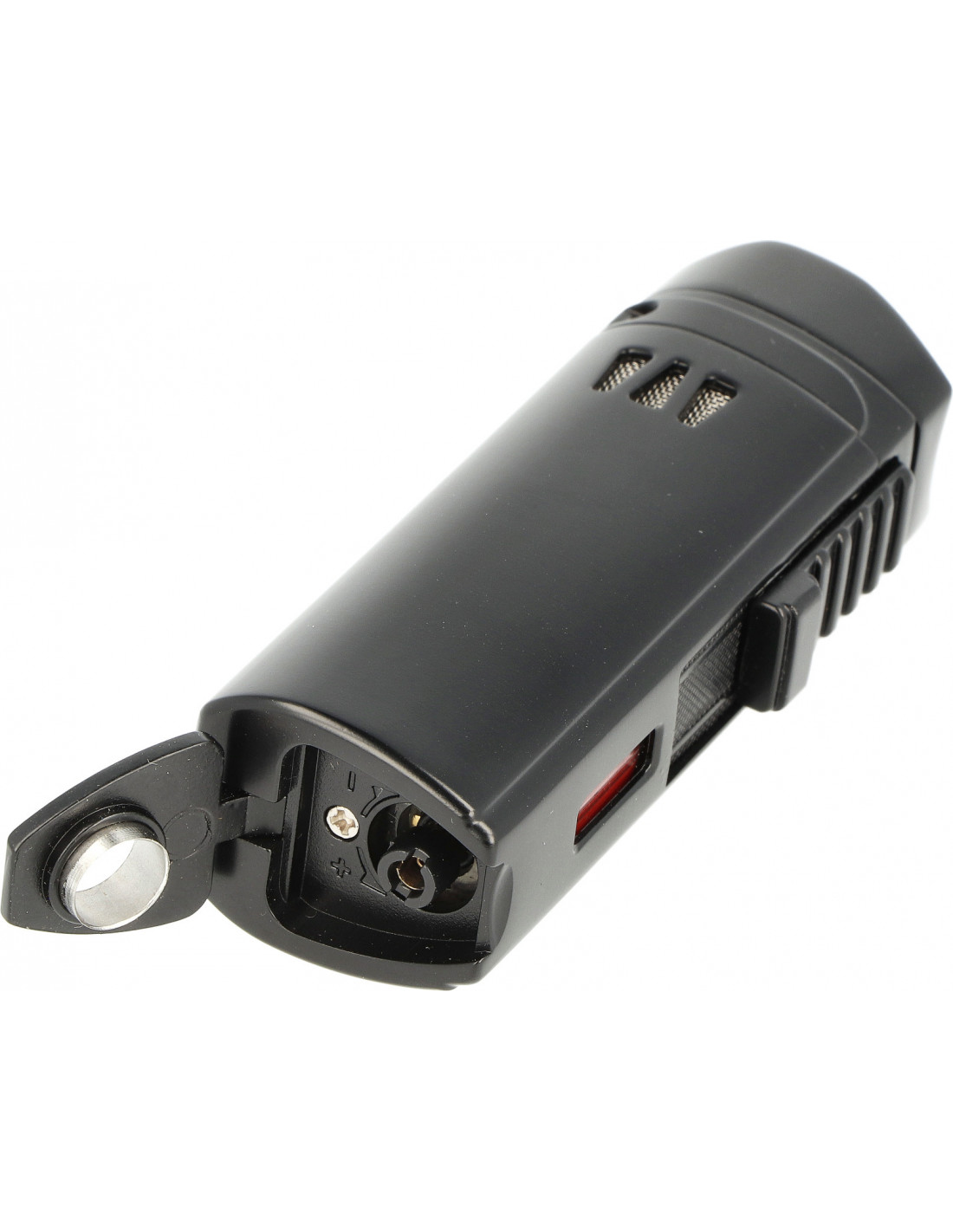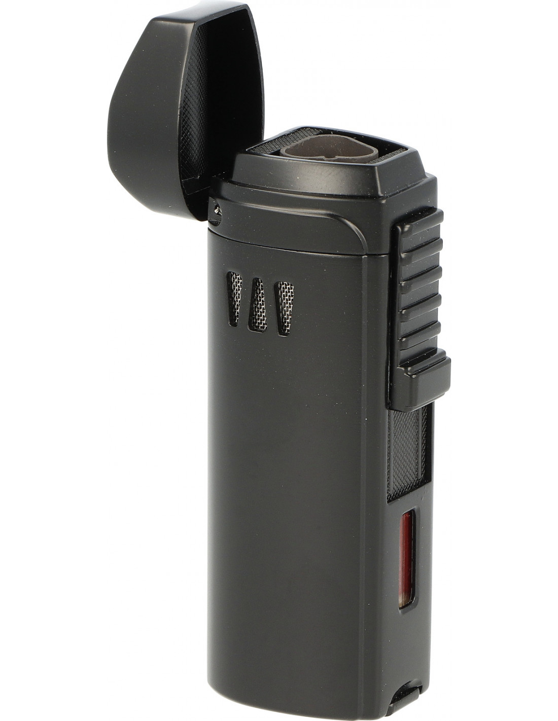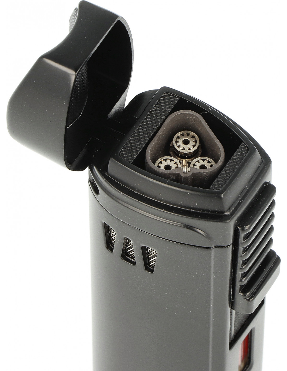 Masivní tryskový zapalovač na cigary je v černém pololesklém provedení. Kovový zapalovač je na čelní straně zdoben perforací, na pravé straně se nachází okénko, díky němuž můžeme kontrolovat hladinu plynu v zapalovači. Po odklopení horního krytu a stlačení bočního tlačítka směrem dolů dojde k zapálení tří trysek. Tyto trysky vyvinou silný plamen na zapálení vaší oblíbené cigary. Cigarový zapalovač je vybaven integrovaným vyštipávačem s průměrem 8,5 mm. V dolní části nalezneme plynový plnící ventil a regulaci intenzity plamene. Zapalovač je dodáván v dárkové krabičce.