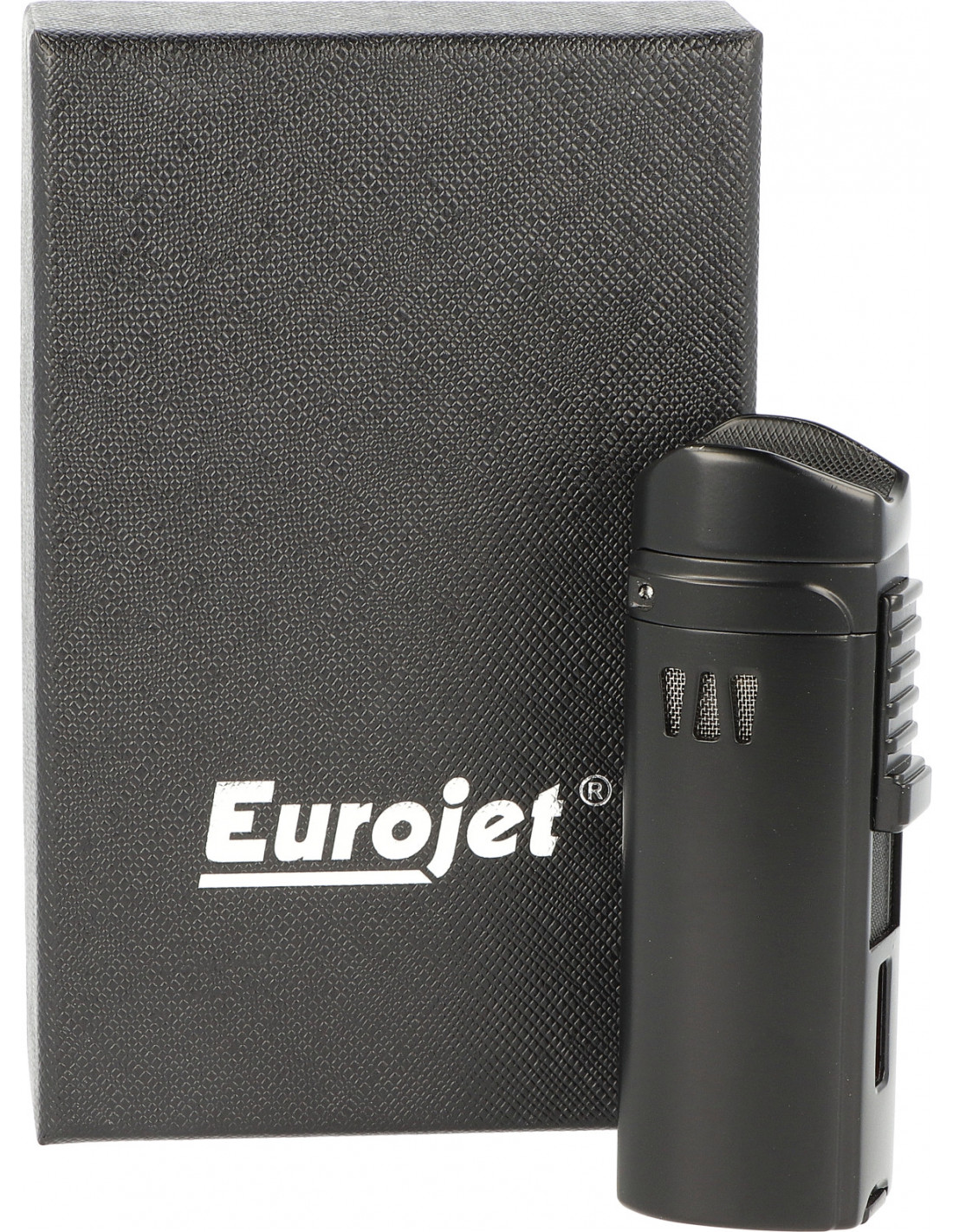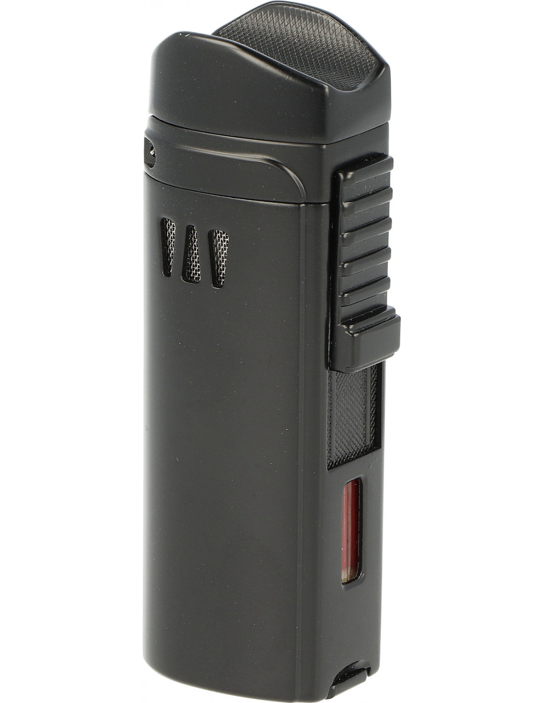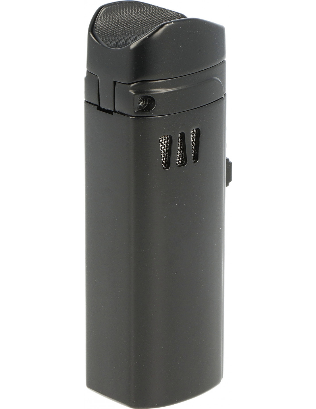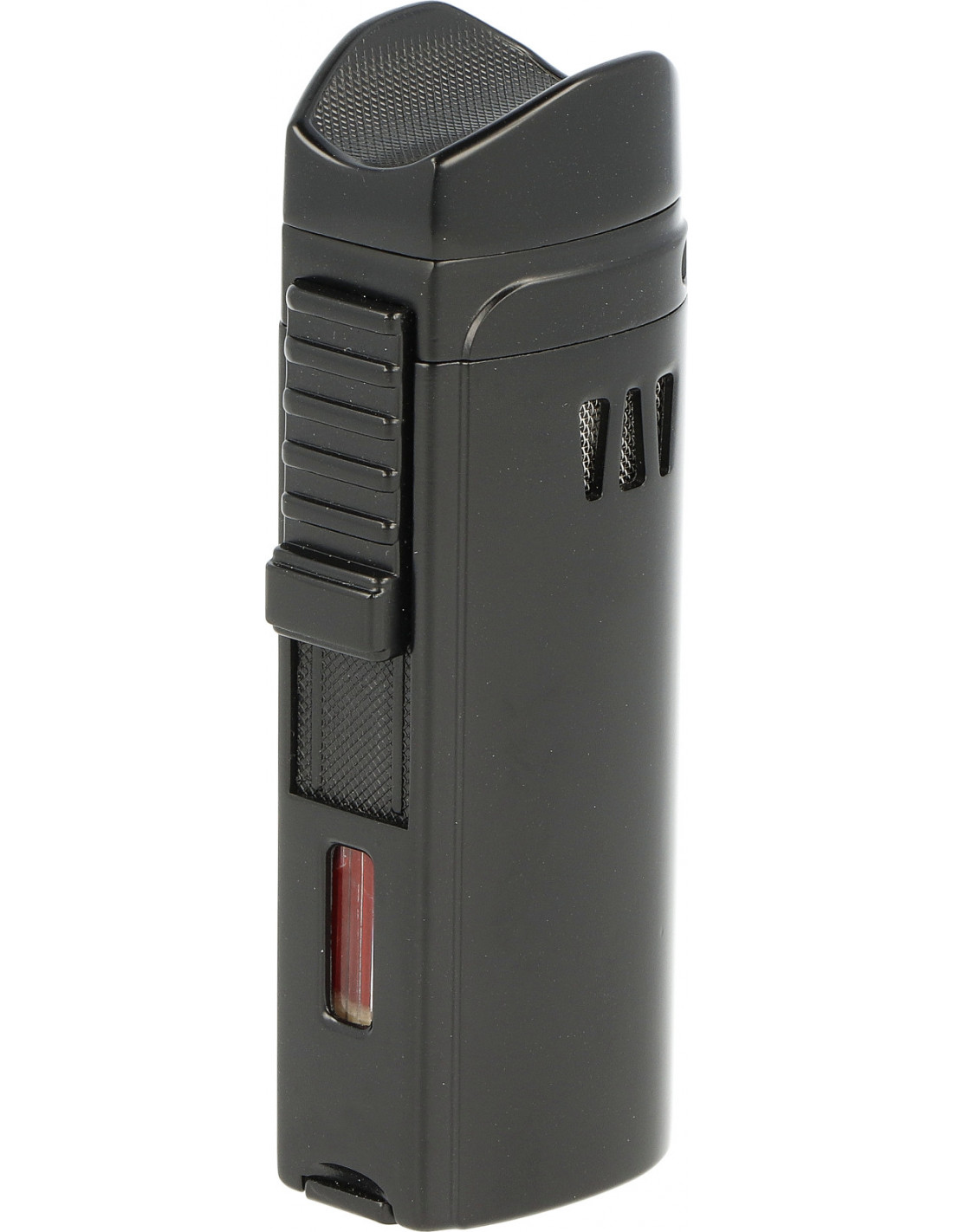 Masivní tryskový zapalovač na cigary je v černém pololesklém provedení. Kovový zapalovač je na čelní straně zdoben perforací, na pravé straně se nachází okénko, díky němuž můžeme kontrolovat hladinu plynu v zapalovači. Po odklopení horního krytu a stlačení bočního tlačítka směrem dolů dojde k zapálení tří trysek. Tyto trysky vyvinou silný plamen na zapálení vaší oblíbené cigary. Cigarový zapalovač je vybaven integrovaným vyštipávačem s průměrem 8,5 mm. V dolní části nalezneme plynový plnící ventil a regulaci intenzity plamene. Zapalovač je dodáván v dárkové krabičce.
