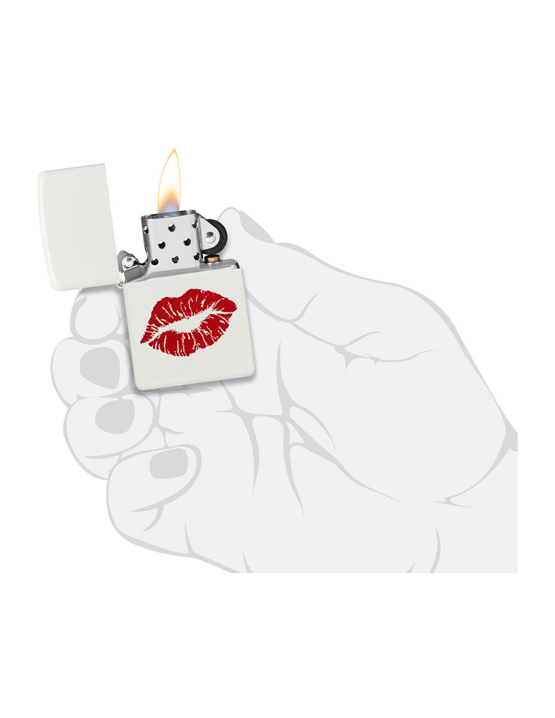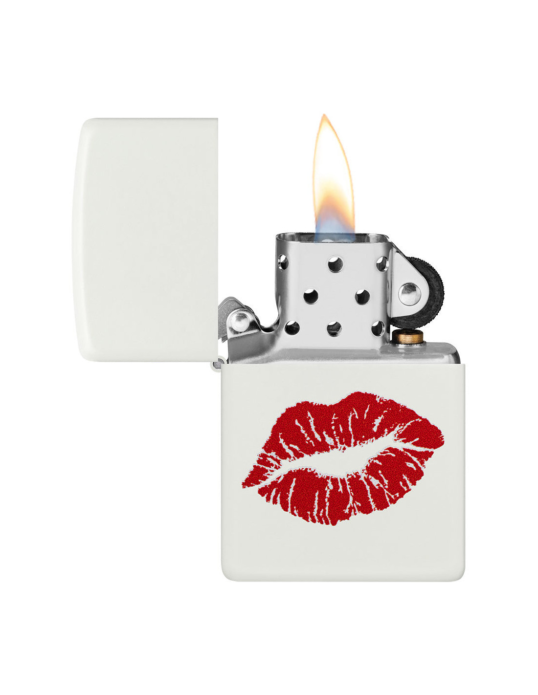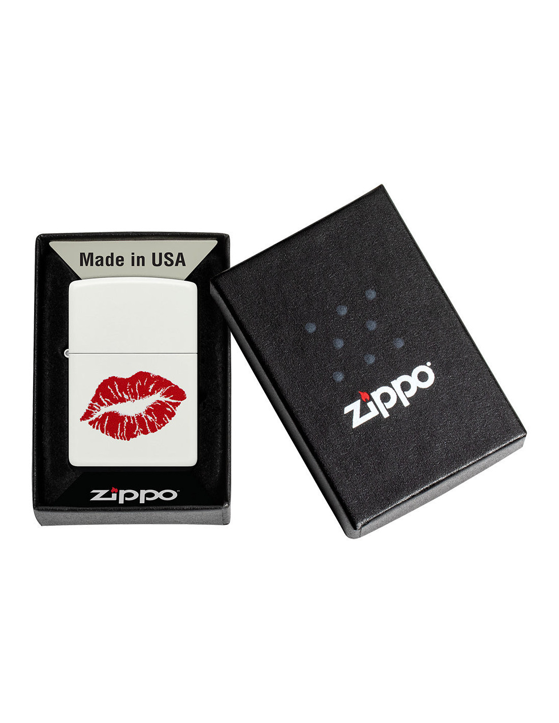 Zapaľovač Zippo s odtlačkom narúžovaných perí. Zippo je kovový benzínový zapaľovač s doživotnou zárukou a viac ako 90 ročnou tradíciou. Tieto kvalitné zapaľovače sa vyrábajú výhradne v USA.