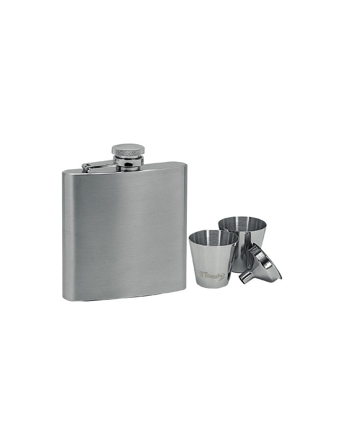 Sada ploskačky o objemu 180 ml, dva pohárky a lievik. Ploskačka je zabalená v krásném dárkovém balení s sametovou výplní, vhodná jako dárek.
