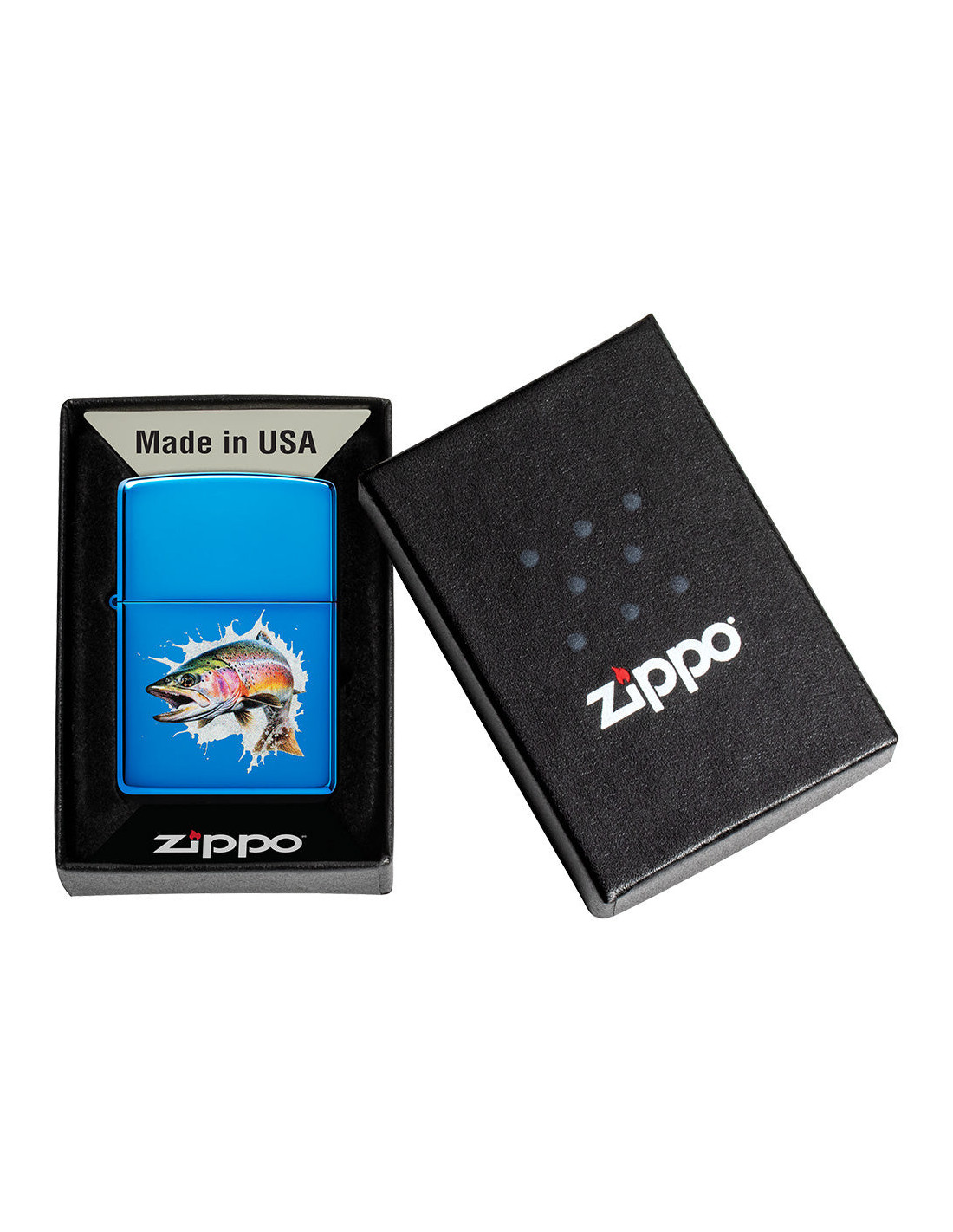 Zapaľovač Zippo s rybárskym motívom. Zippo je kovový benzínový zapaľovač s doživotnou zárukou a viac ako 90 ročnou tradíciou. Tieto kvalitné zapaľovače sa vyrábajú výhradne v USA.