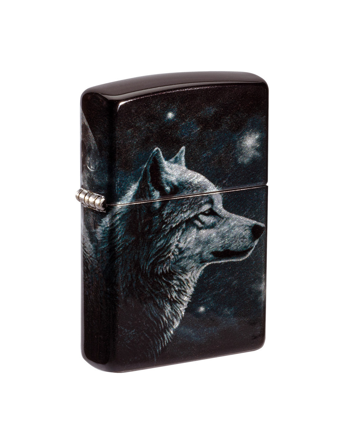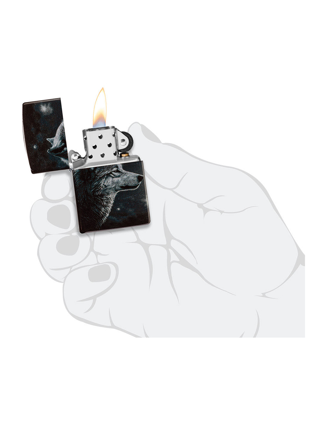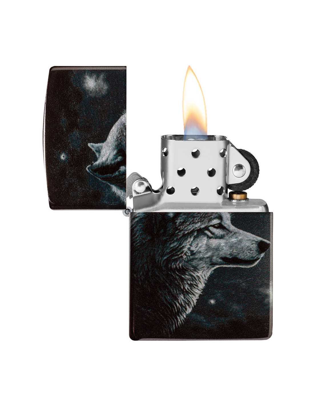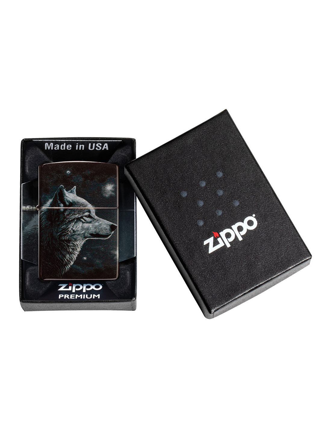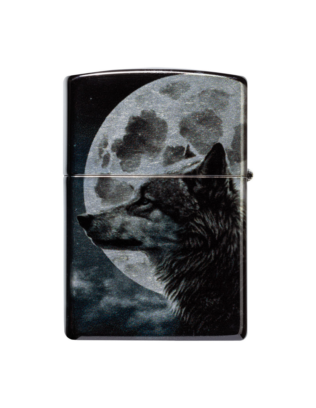 Zapaľovač Zippo s motívom vlkov s mesiacom v pozadí. Zippo je kovový benzínový zapaľovač s doživotnou zárukou a viac ako 90 ročnou tradíciou. Tieto kvalitné zapaľovače sa vyrábajú výhradne v USA.