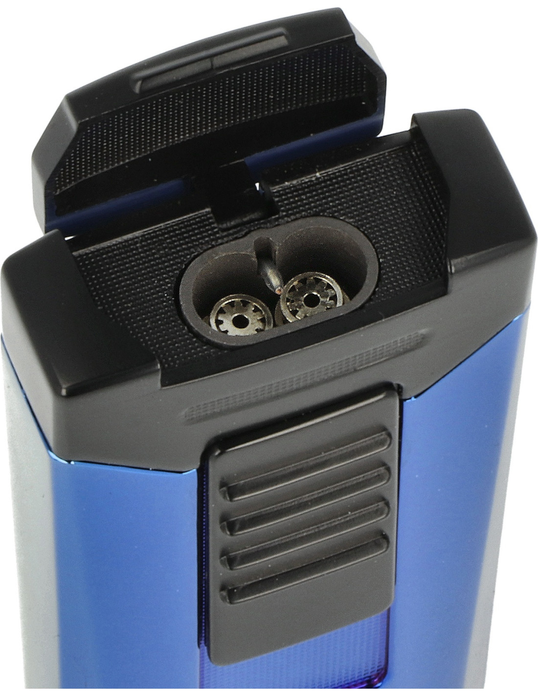 The metal jet lighter for cigars features a glossy blue finish combined with black elements. When the top cover is flipped open and the front button is pressed down, two jets ignite, producing a strong flame to light your favorite cigar. At the bottom, there is a gas refill valve and a flame intensity adjustment. The lighter comes in a gift box.