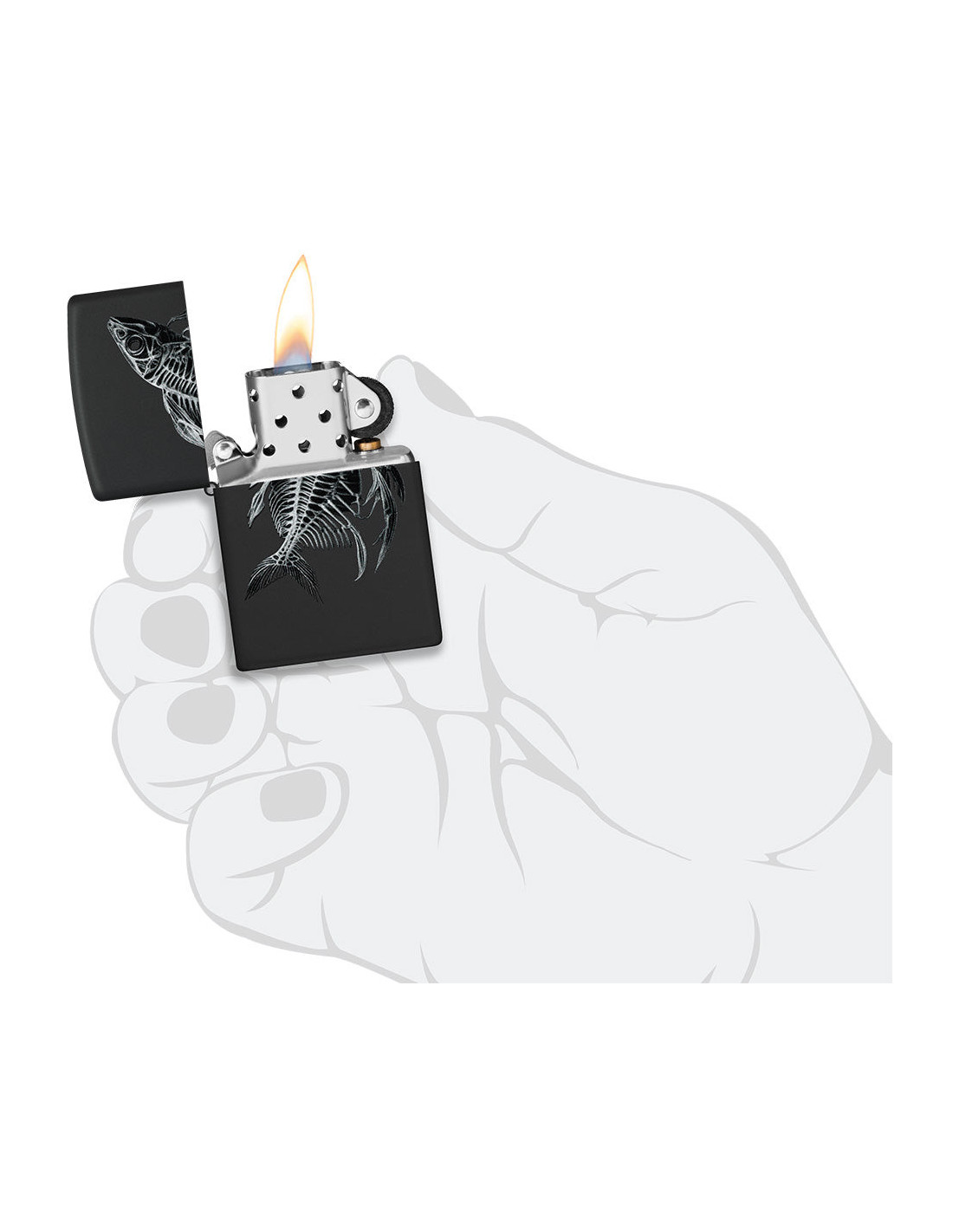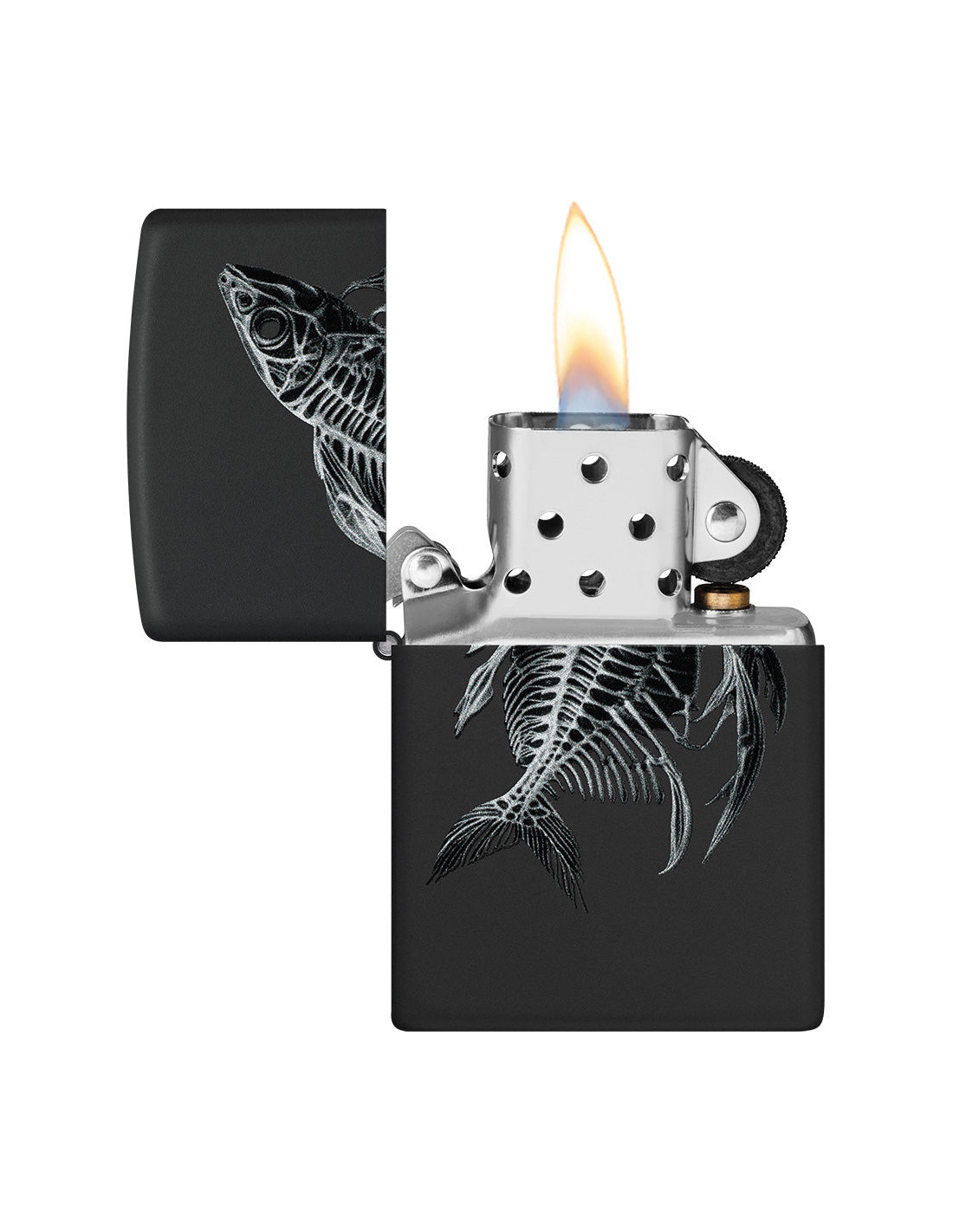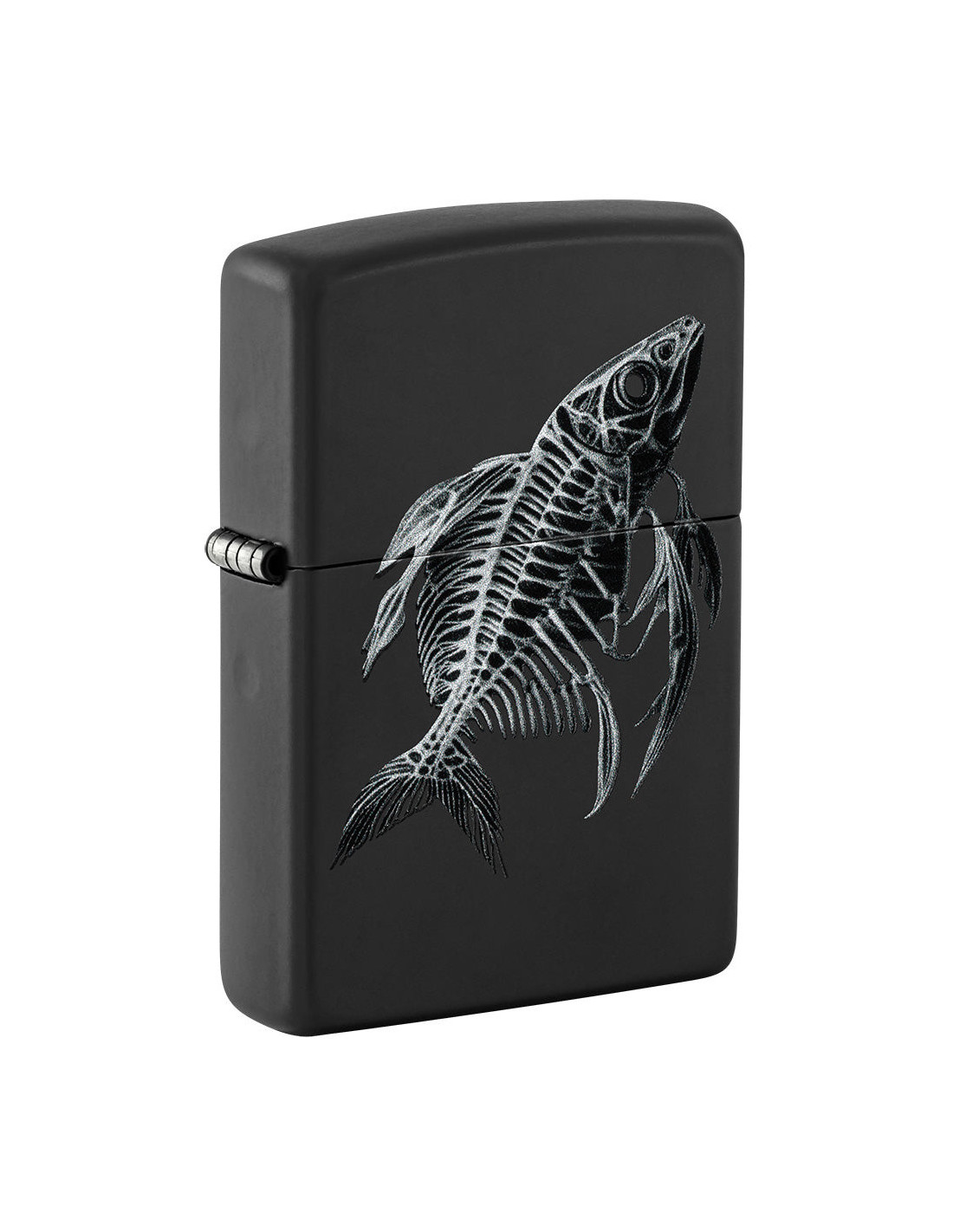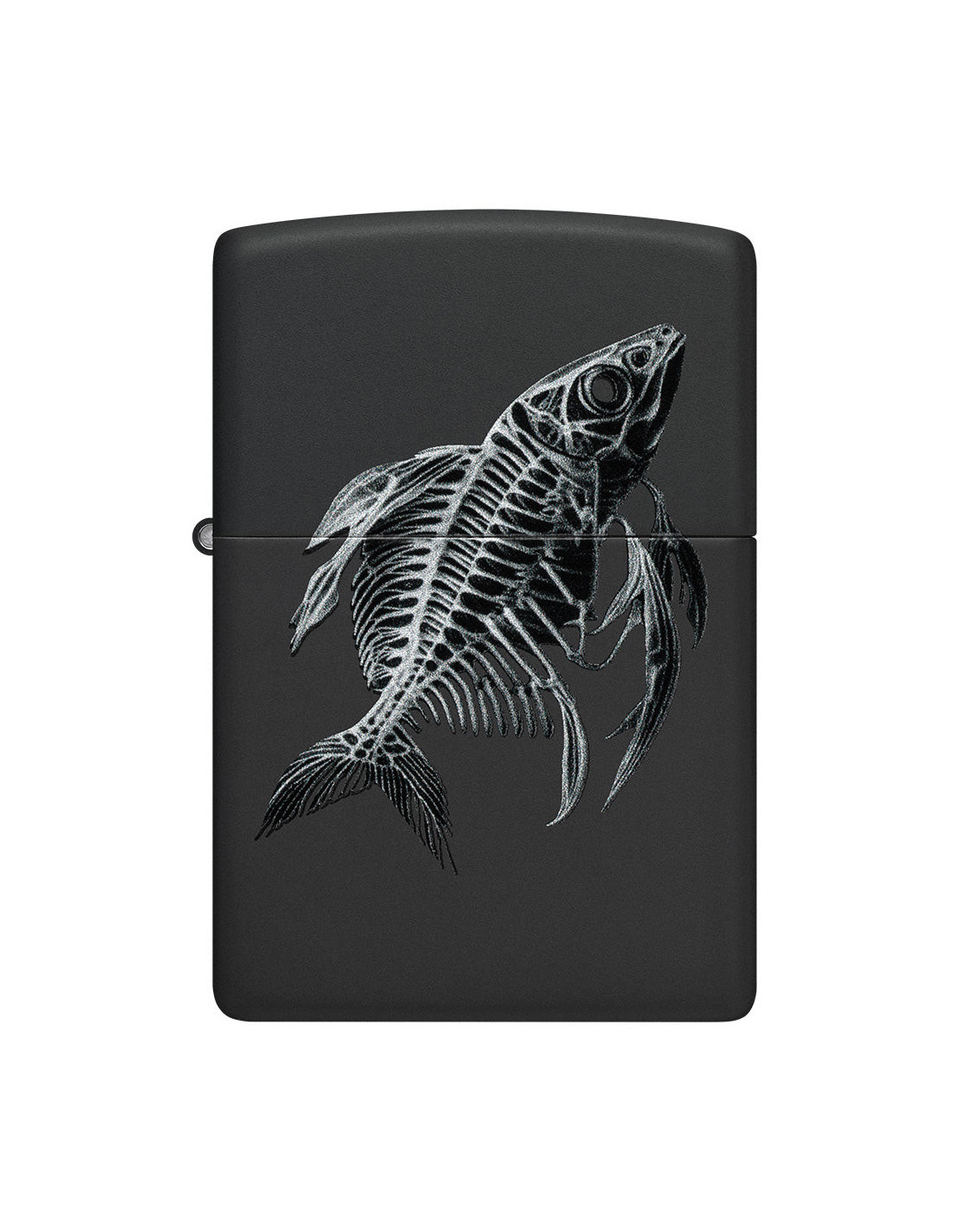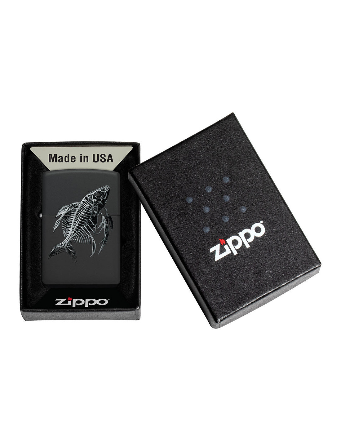 Zapaľovač Zippo s obrázkom kostry ryby. Zippo je kovový benzínový zapaľovač s doživotnou zárukou a viac ako 90 ročnou tradíciou. Tieto kvalitné zapaľovače sa vyrábajú výhradne v USA.